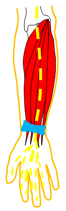 左図に描かれた赤い部分が前腕屈筋群で、黄色の点線が正中神経で筋肉の中を走行しています。水色の部分は、横手根靭帯(屈筋支帯)になります。